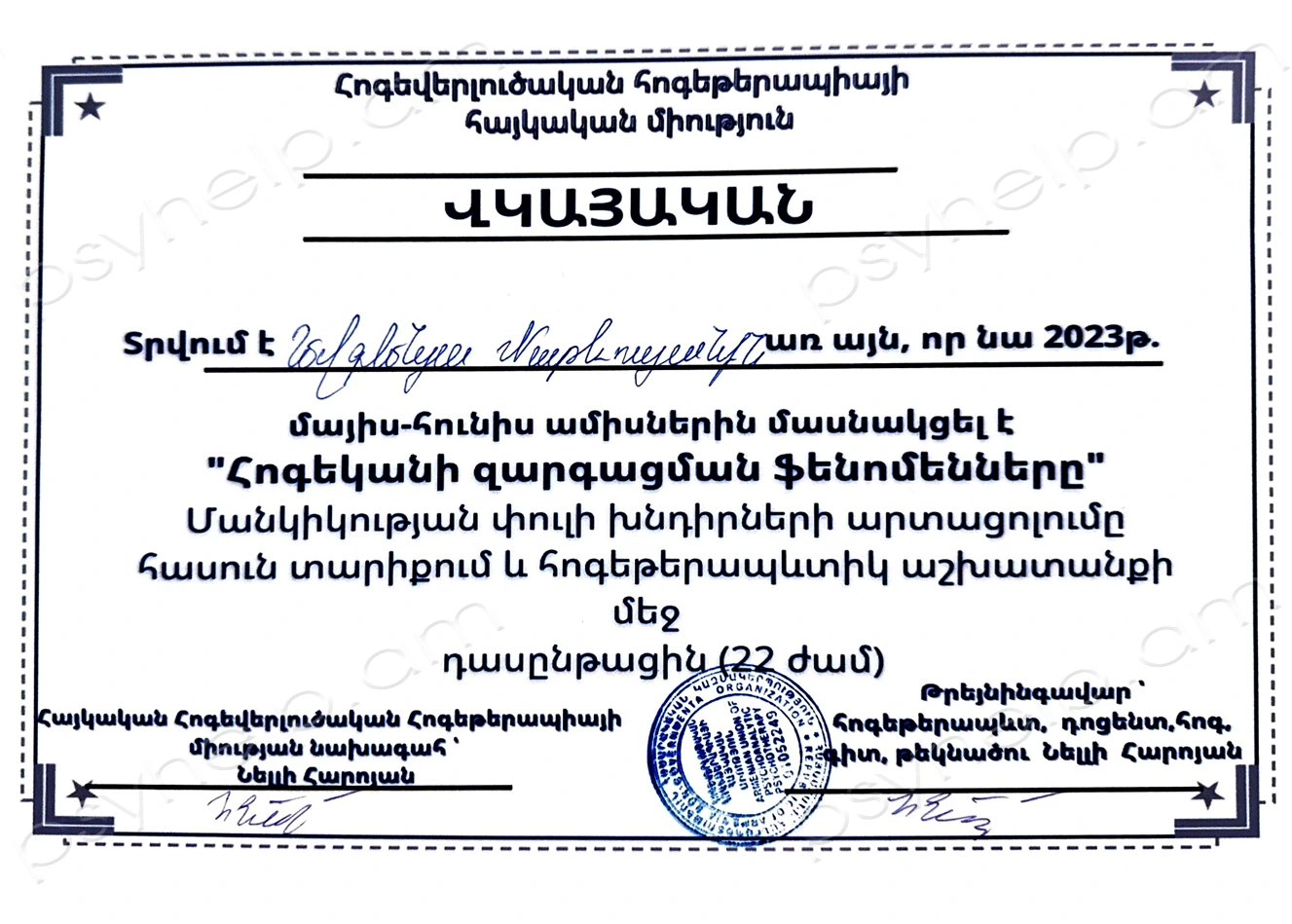- 2022թ. դեկտեմբեր - «Նեյրոլեզվաբանական ծրագրավորում» (NLP) դասընթաց։ Երևան։
