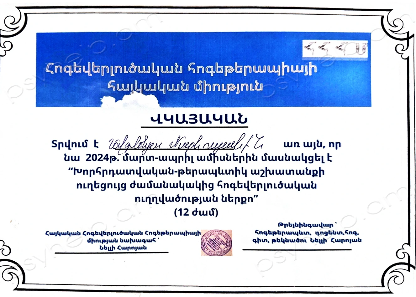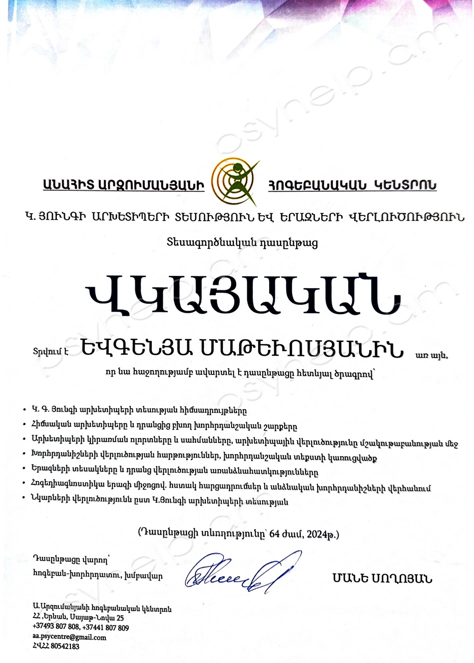 - 2024թ. դեկտեմբեր - «Կ․ Յունգի արխետիպերի տեսություն և վերլուծություն» տեսագործնական դասընթաց։ Անահիտ Արզումանյանի հոգեբանական կենտրոն։ Երևան: