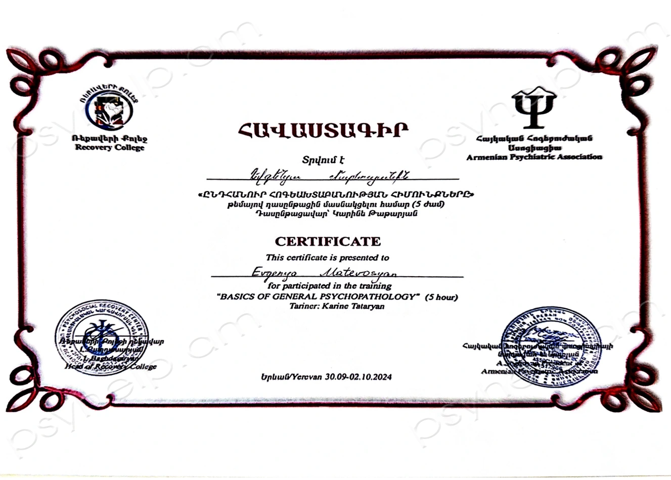 - 2024թ. սեպտեմբեր - «Ընդհանուր հոգեախտաբանության հիմունքներ» դասընթաց։ Ռեքավերի քոլեջ և Հայկական Հոգեբուժական ասոցիացիա։ Երևան։