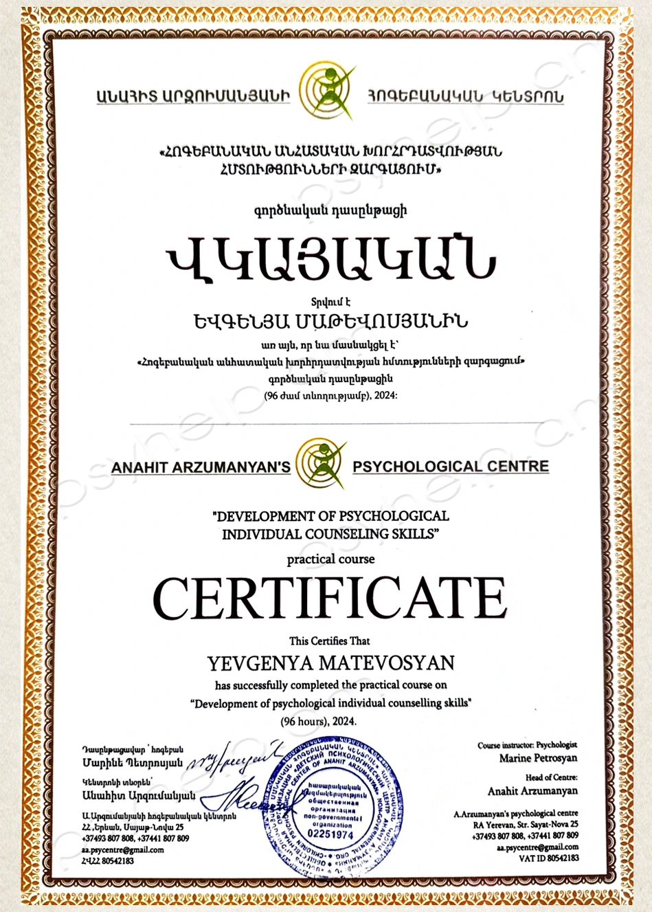 - 2022թ. դեկտեմբեր - «Սոմատոհոգեթերապևտիկ տեխնիկաներ» գործնական դասընթաց։ Անահիտ Արզումանյանի հոգեբանական կենտրոն։ Երևան: