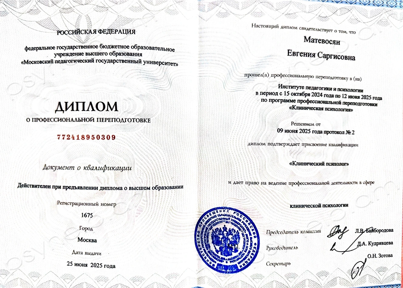 - 2025-2026թթ. - Վարդանանց նորարական բժշկության կենտրոն։ Կլինիկական հոգեբան։