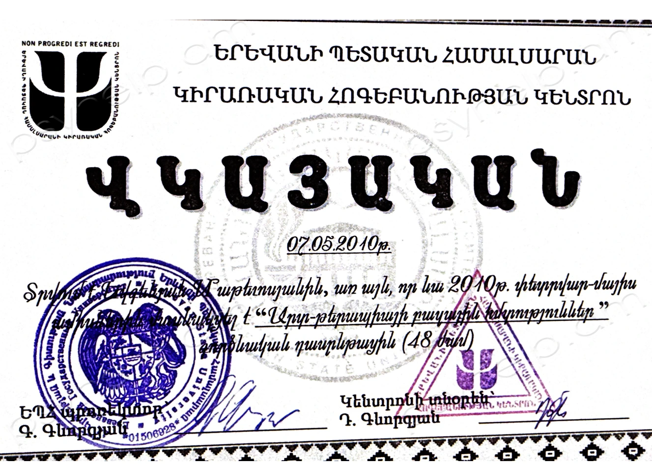 - 2010թ. մայիս - «Արտ-թերապիայի բազային հմտություններ» գործնական դասընթաց։ ԵՊՀ։ Երևան։