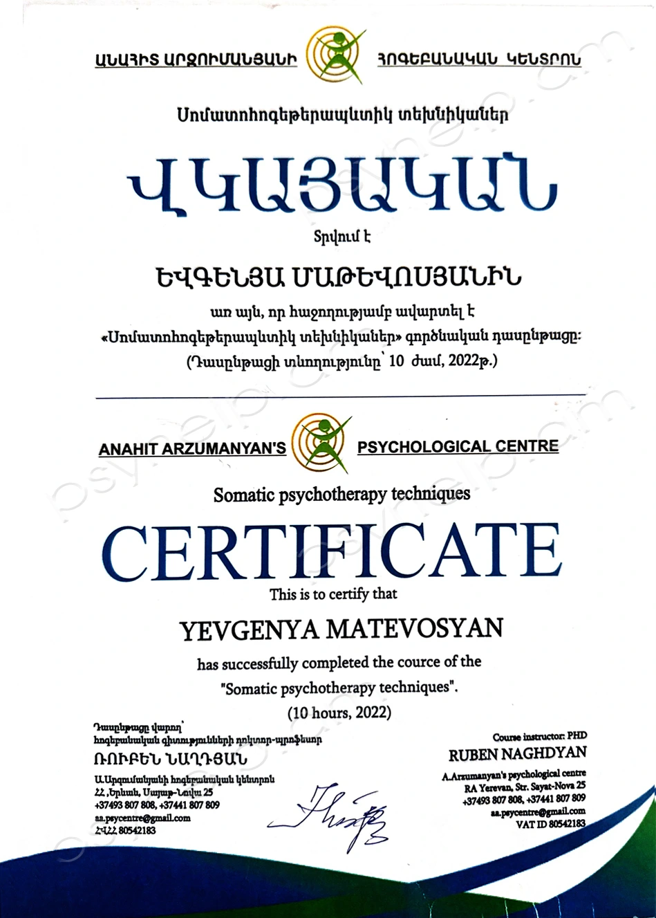 - 2022թ. դեկտեմբեր - «Սոմատոհոգեթերապևտիկ տեխնիկաներ» գործնական դասընթաց։ Անահիտ Արզումանյանի հոգեբանական կենտրոն։ Երևան: