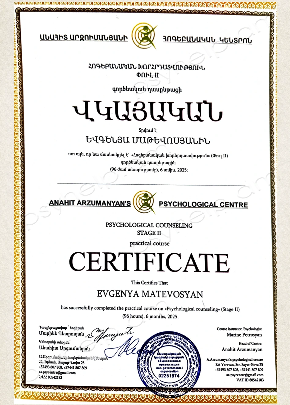 - 2025-2026թթ. - Վարդանանց նորարական բժշկության կենտրոն։ Կլինիկական հոգեբան։