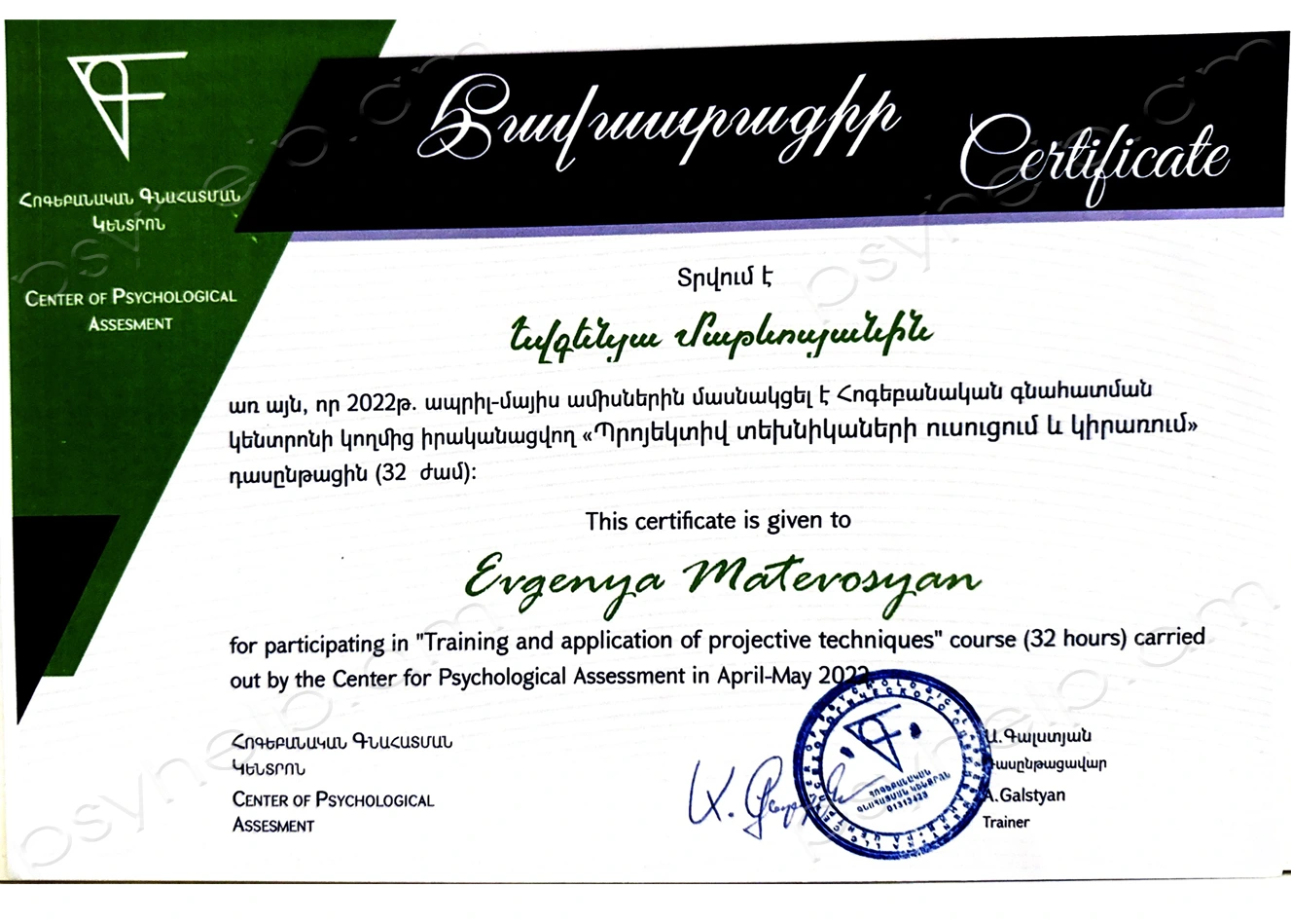 - 2022թ. մայիս - «Պրոյեկտիվ տեխնիկաների ուսուցում և կիրառում» դասընթաց։ Հոգեբանական գնահատման կենտրոն։ Երևան։