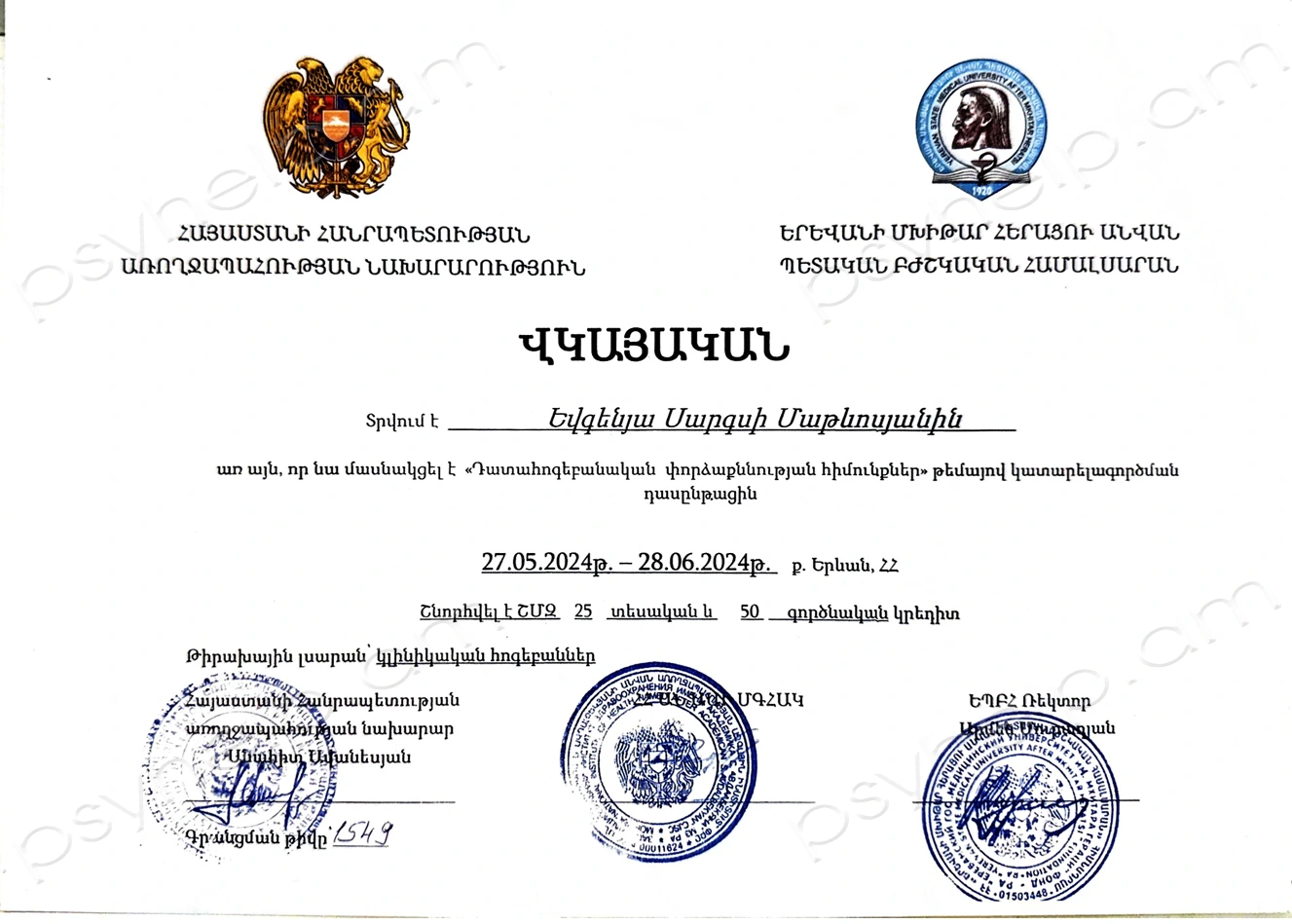 - 2024թ. հունիս - «Դատահոգեբանական փորձաքննության հիմունքներ» դասընթաց։ ՀՀ Առողջապահության Նախարարություն և Երևանի Մխիթար Հերացու անվան Պետական Բժշկական համալսարան։ Երևան: